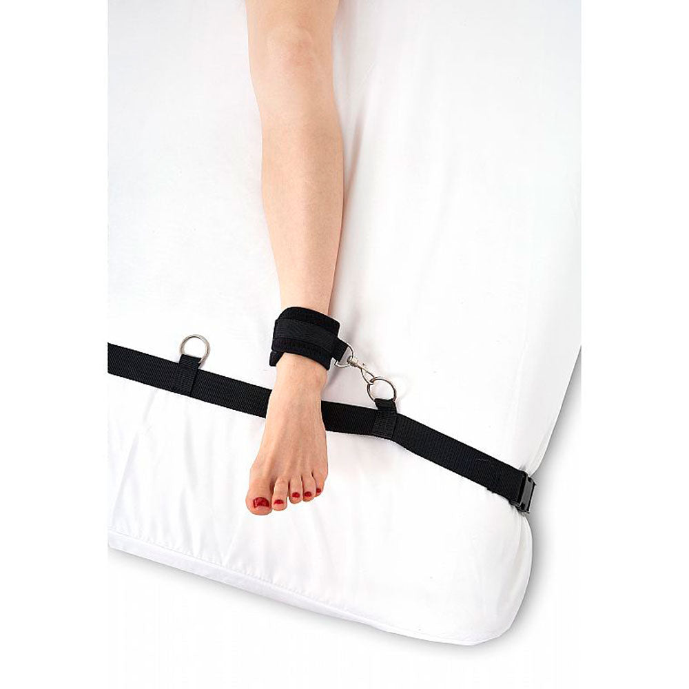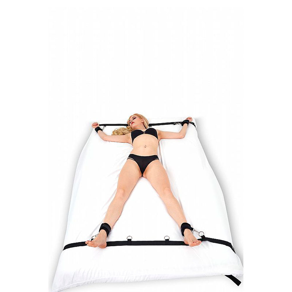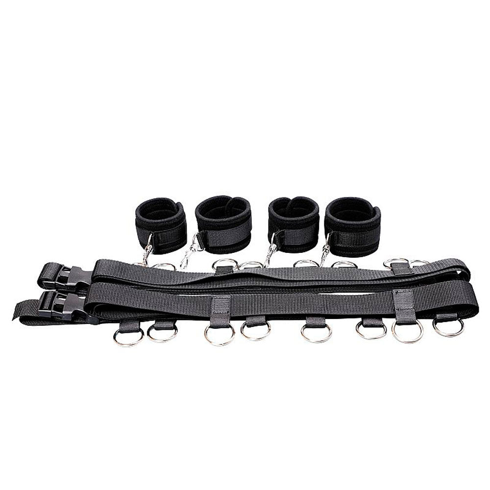 Algema distanciadoras para pulso e tornozelo. Deixe seu amor com as mãos e pés bem separados, imobilizados com essas algemas em nylon e fechos afiveláveis com distanciador longo.