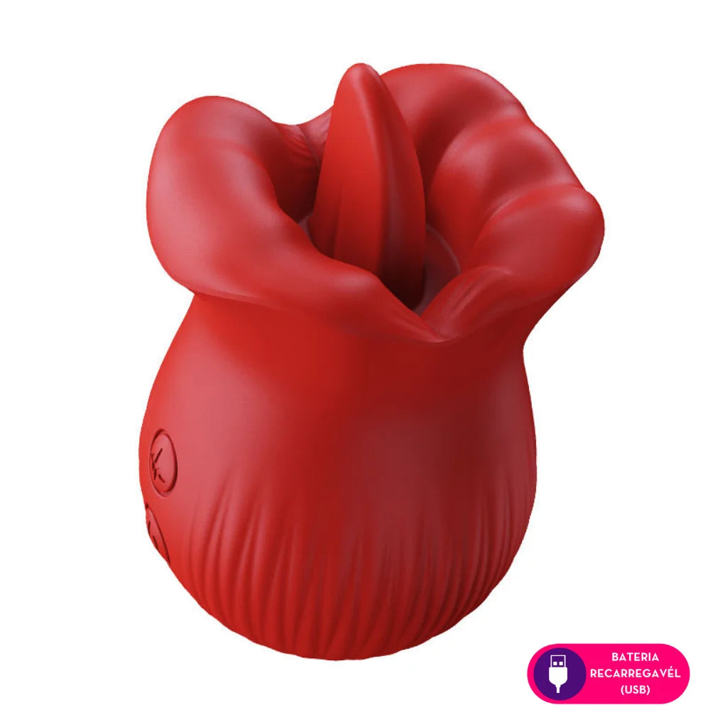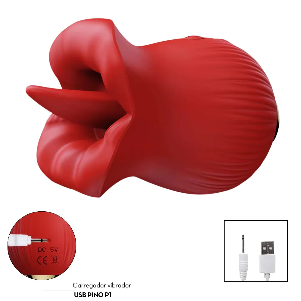 Estimulador clitoriano em formato de boca em silicone, com língua vibratória e movimentações na boca com a ponta vibrátoria. Possui toque suave, aveludado e detalhes metalizados.