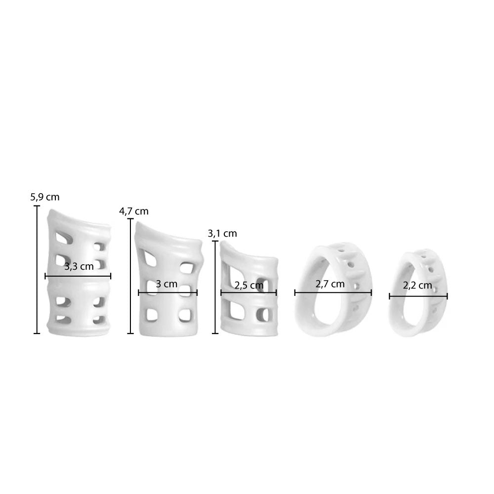 Com cinco tamanhos diferentes para escolher, este kit versátil atende às necessidades individuais de cada usuário, permitindo um ajuste perfeito e seguro. Os anéis penianos são fáceis de usar, oferecendo uma experiência prazerosa e segura.