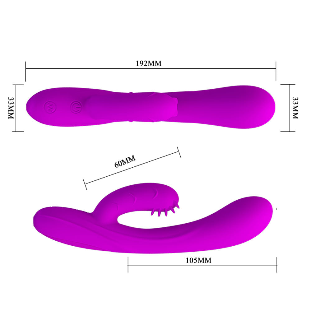 Vibrador Pretty Love contém estimulador clitoriano rotativo com saliências que lembram a língua, feito 100% silicone, material macio com toque aveludado. Seu estimulador vibra simultaneamente com vibrador principal em uma programação de 30 Variações de vibração.
